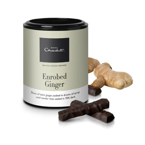 Spicy stem ginger sticks soaked in syrup until tender, then enrobed in 70% dark chocolate.