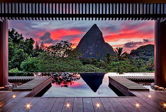 “To-die-for views of the Piton Mountains and the Caribbean Sea, and its clean lines, dark wood and white walls contrast wonderfully with the rainforest that surrounds it.”